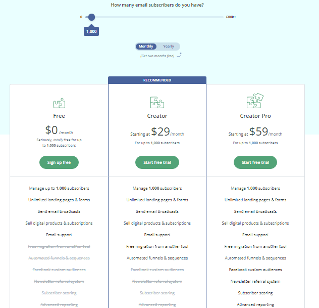 In any case, ConvertKit has three general levels. Each layer provides exactly the same set of features, and the price increase depends entirely on the number of subscribers you want to reach. This is how it breaks down.