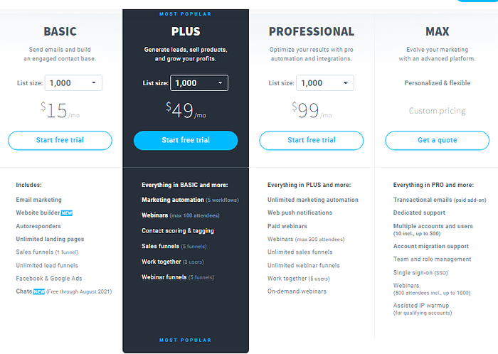 Let’s start with the most basic package. If you want to communicate with up to 1,000 people, it will cost you $15 per month. If you are not familiar with email marketing, this is not a bad starter package, it will definitely get you started right away.